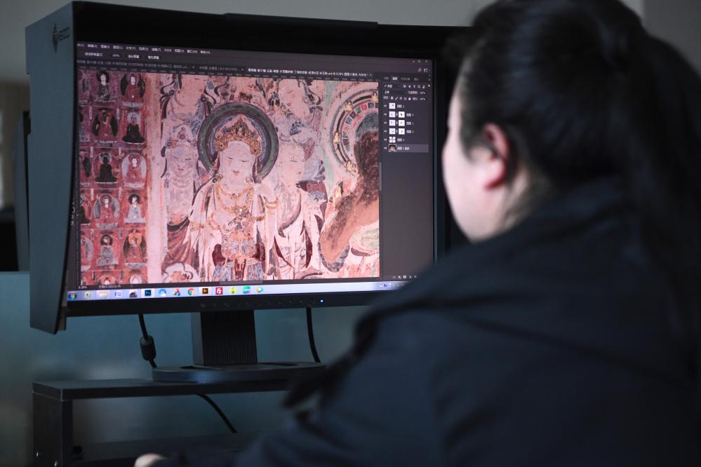 2023年4月25日,敦煌研究院文物数字化保护团队图像处理人员在拼接壁画图像。新华社记者 陈斌 摄