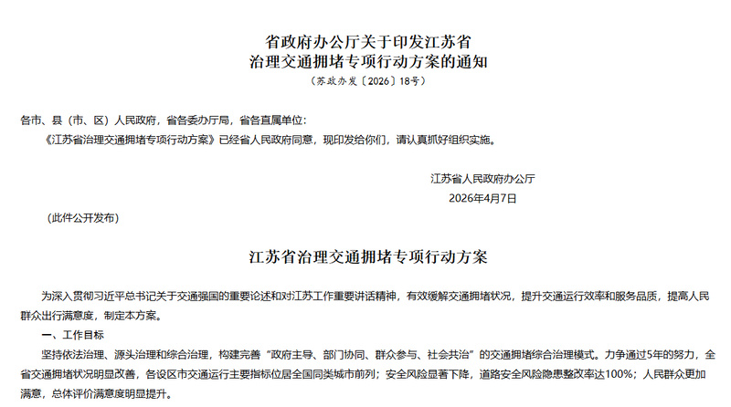 日前,江苏省政府办公厅印发《江苏省治理交通拥堵专项行动方案》(以下简称《方案》),不仅系统部署了疏堵保畅的“路线图”,更立下“军令状”:力争通过5年努力,全省交通拥堵状况明显改善,道路安全风险隐患整改率达100%。