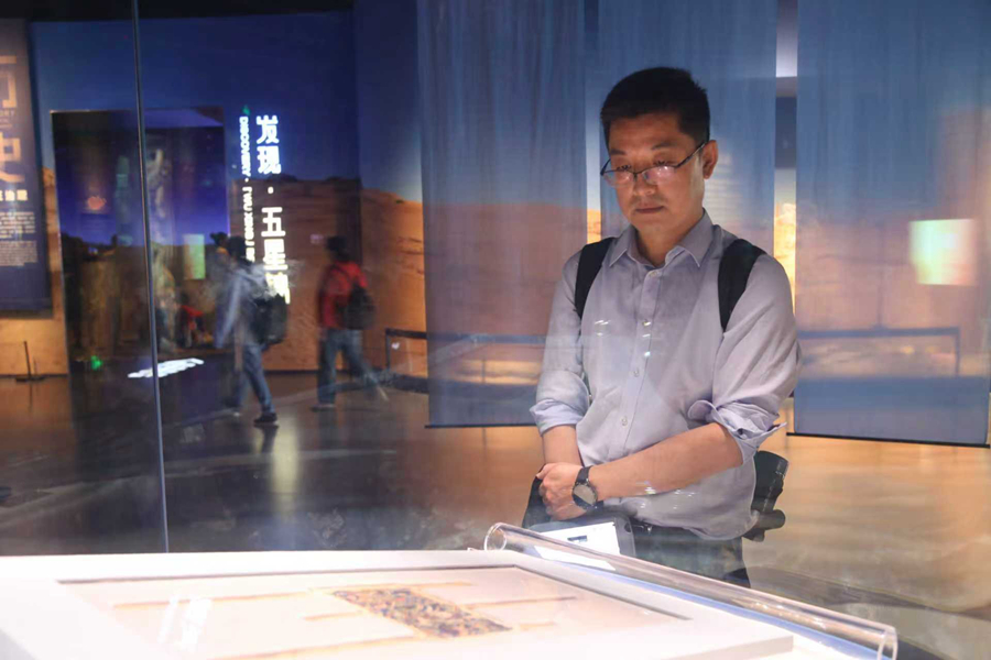 游客正望着“五星出东方利中国”锦护臂沉思。张琪 摄
